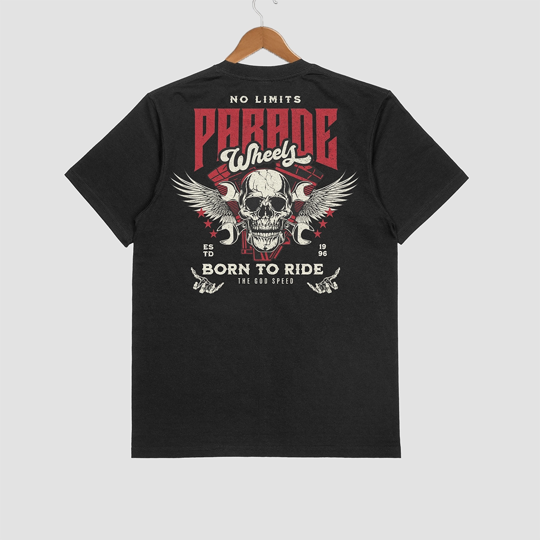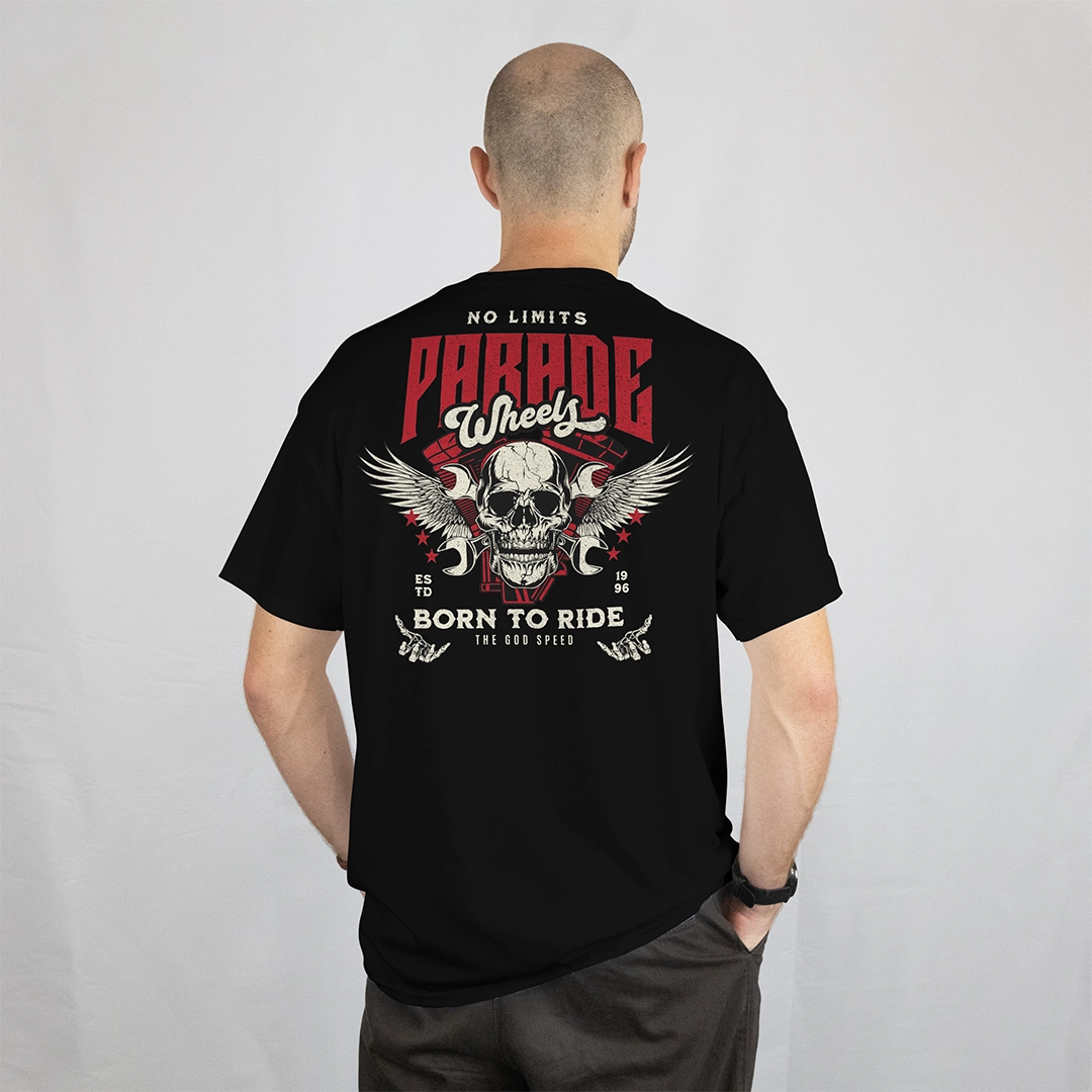 تيشيرت رجالي أسود بتصميم جمجمة مجنّحة جريء، مكتوب عليه “Born to Ride – The God Speed”، بيعبر عن حب التحدي والسرعة بدون حدود.