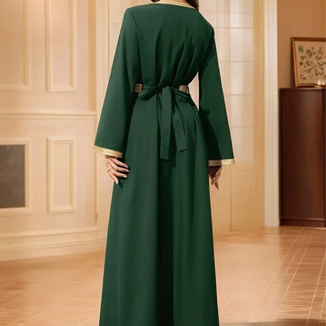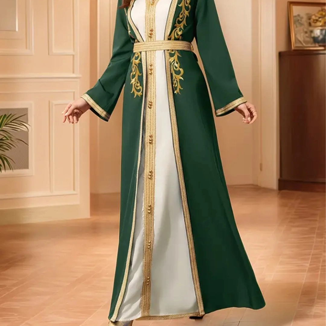 - حزام بلون ذهبي يعزز جمال التصميم ويمنح القفطان تناسقاً أنثوياً رائعاً