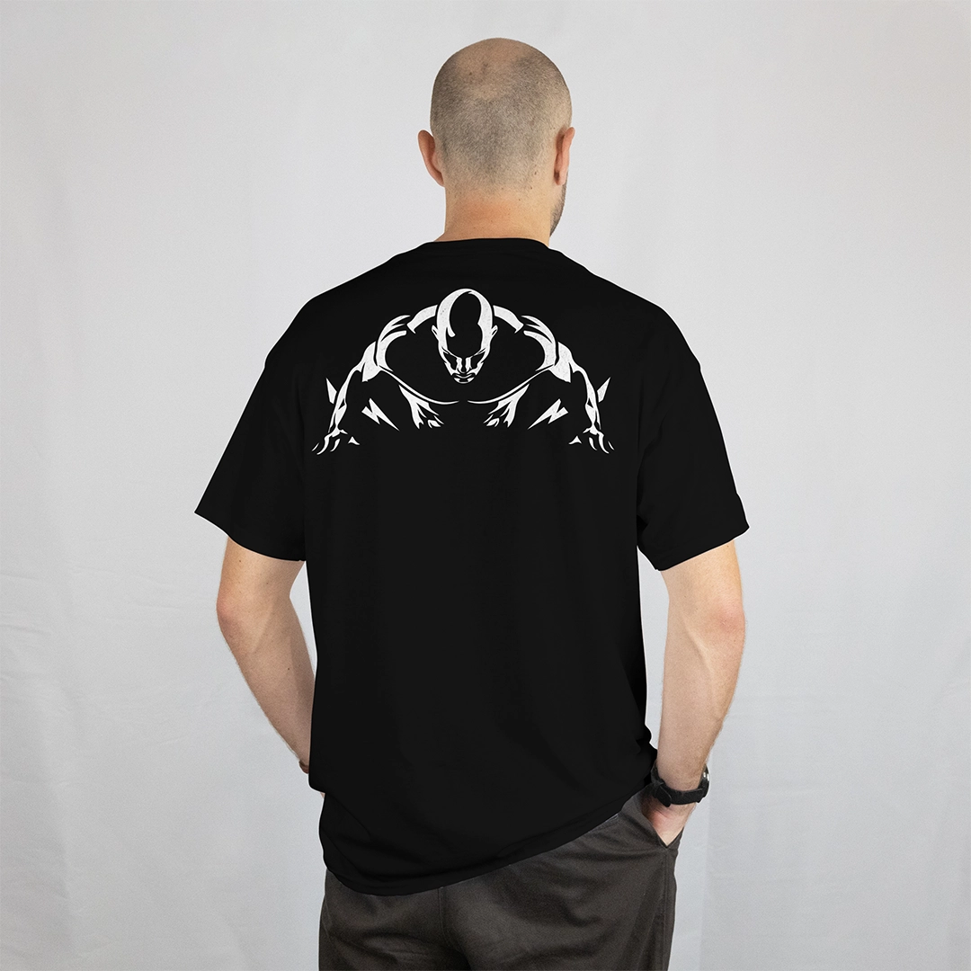 صميم خاص لعشاق التمرين والتركيز، برسمة محارب رياضي بوضعية Push-up ترمز للقوة والانضباط. التيشيرت أسود أنيق برسمة بيضاء على الظهر، يخاطب العقل قبل العضلات.